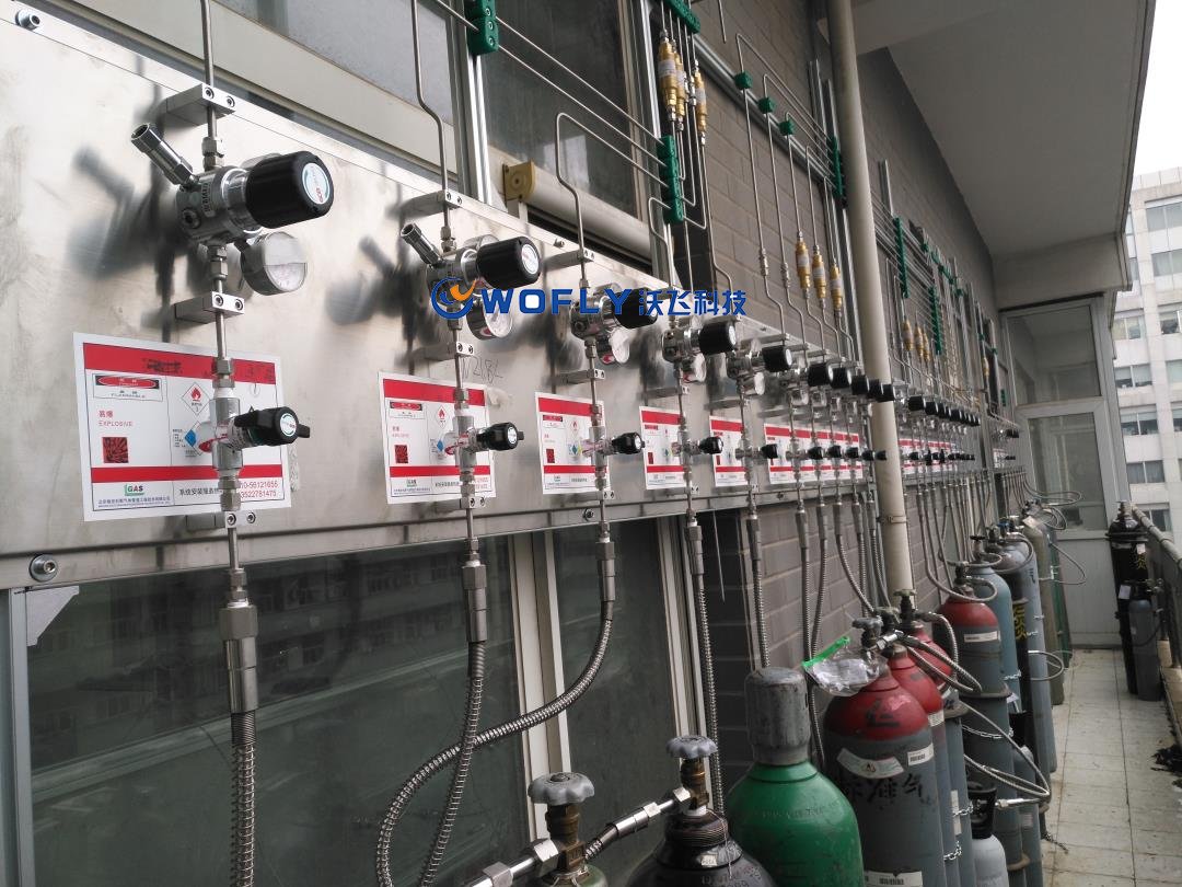 實(shí)驗(yàn)室用氣主要有不燃?xì)怏w(氮?dú)?、二氧化碳)、惰性氣體(氬氣、氦氣等)、易燃?xì)怏w(氫氣、一氧化碳)、劇毒氣體(氟氣、氯氣)及助燃?xì)怏w(氧氣)組成,可以通過(guò)輸氣管接到各實(shí)驗(yàn)室內(nèi)。一般氣相室配置氦氣(He)、氮?dú)猓∟2)。氣質(zhì)聯(lián)用室配置氮?dú)?、氫氣、氧氣。所有管線(xiàn)在安裝完畢后一定要做氣密性實(shí)驗(yàn),嚴(yán)禁有泄露的可能。由于管道細(xì)小,管間距小,安裝過(guò)程中可依據(jù)現(xiàn)場(chǎng)情況進(jìn)行調(diào)整,氣瓶裝柜時(shí),易燃易爆與惰性氣體同柜,杜絕兩種易燃?xì)怏w氣瓶同柜。