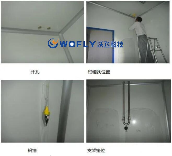 安裝時,先在頂棚打出與管道同尺寸的孔洞,將固強(qiáng)套管固定在孔洞上,然后再將做好的支吊架自下而上的穿過頂棚,按照預(yù)設(shè)的高度,將支架固定在墻面上。